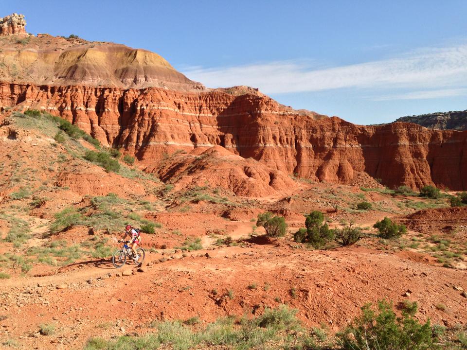 First stop: Palo Duro Canyon in Amarillo, TX.  The trails were fantastic and the scenery was unlike anything I had ever seen.  Red dirt, boulders, cacti, tarantulas crossing the trail at their leisure.  It literally felt like we were mountain biking on Mars.