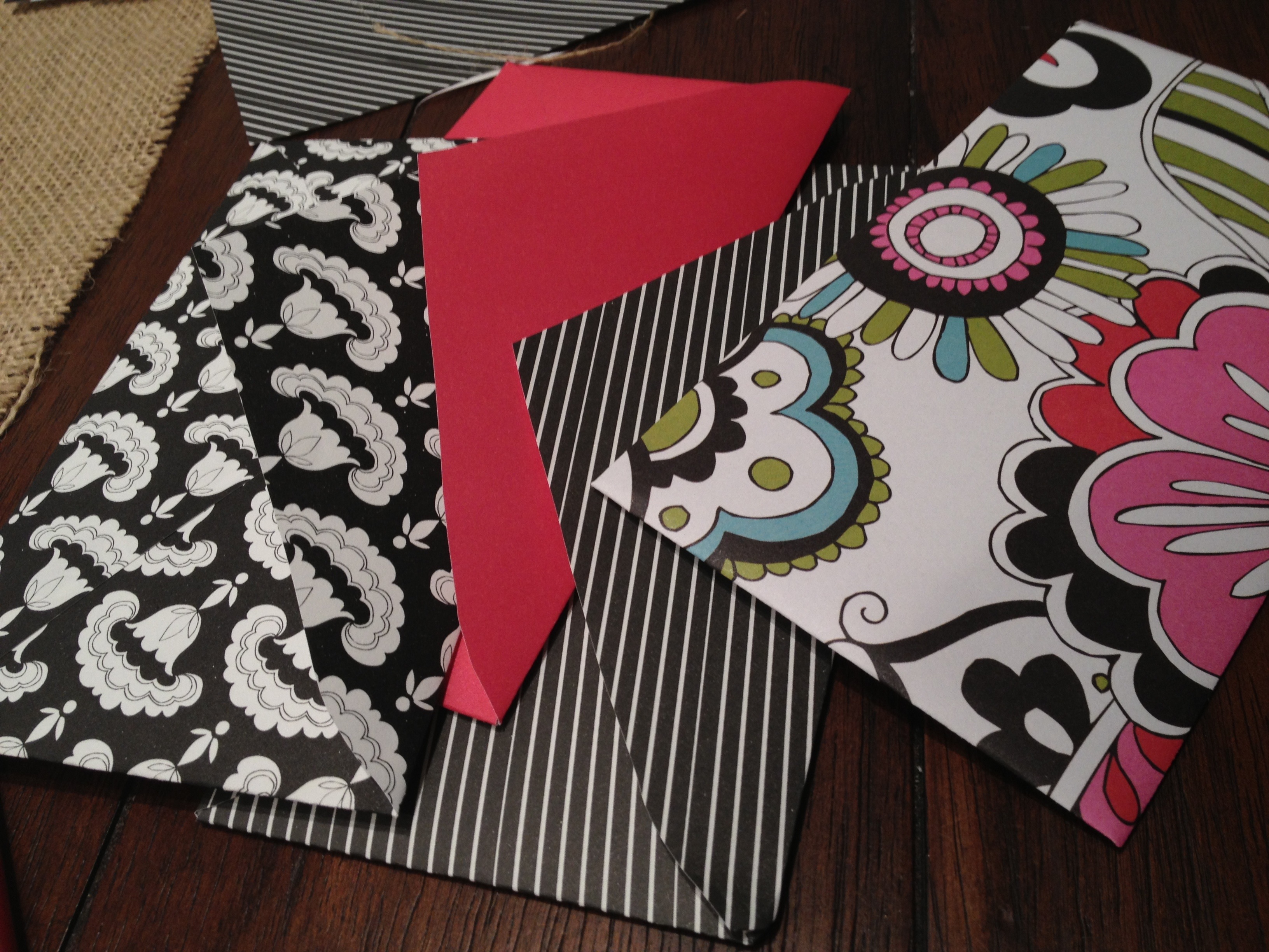 Tonight I bought some scrapbook paper from the store ($5.00 for 50 sheets) and used an envelope in my desk as a template to make cute envelopes!