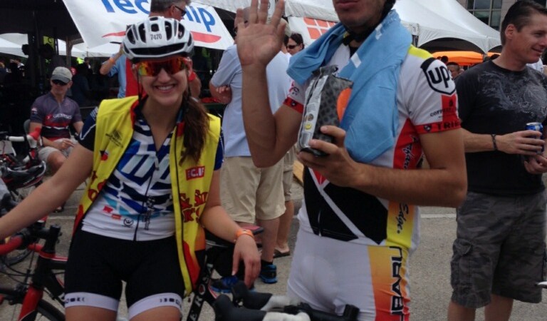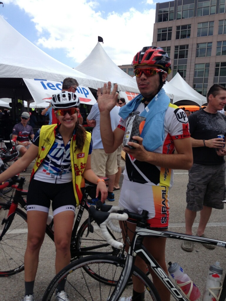 A photo of my teammate and I at the end of the 180+ mile ride last year! Repping both of my teams – Team HP and Team Sun & Ski!